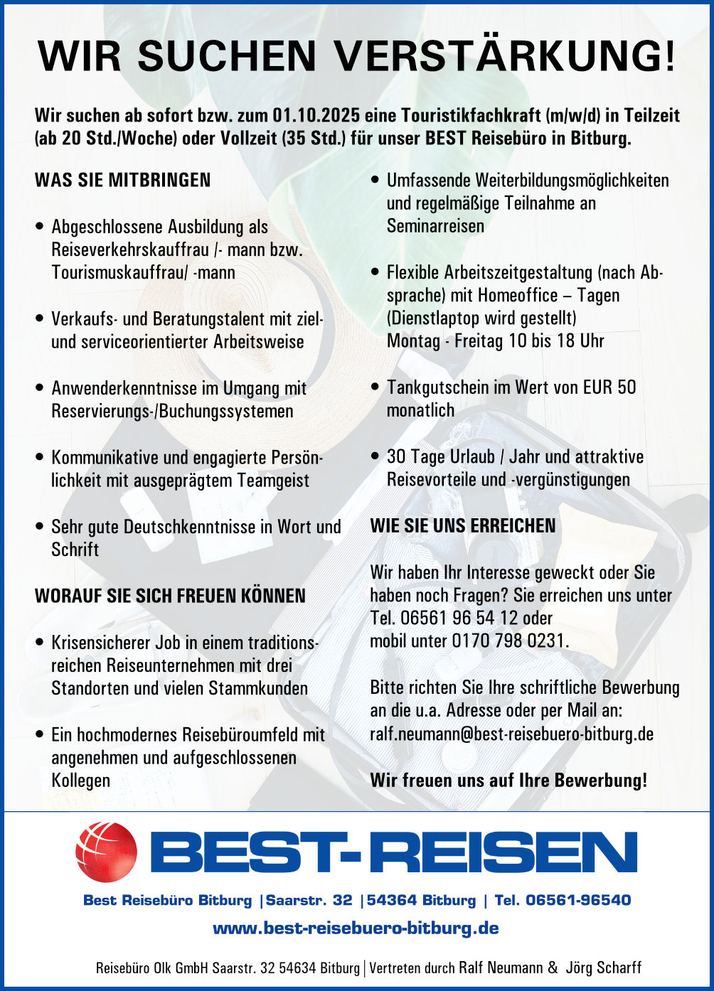 Ihr Reisebüro in Bitburg führt Sie durch den Angebotsdschungel: Egal ob Strandurlaub, Familienreise, Kreuzfahrt oder Wellness-Tripp - wir sind für Sie da.